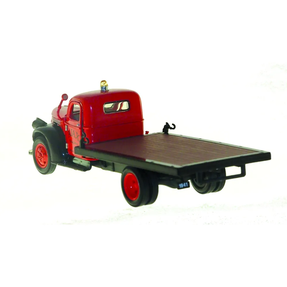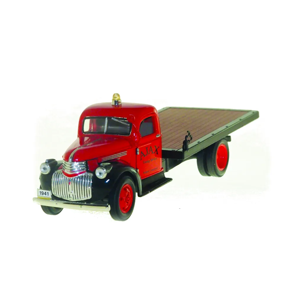 The 1941 Ajax Flatbed, in 1:32 scale, is meticulously detailed with towing hooks, a baked enamel finish, dual running boards, and official Chevrolet logos. It includes opening cab doors and a hood that reveals the engine compartment, along with a spare tire located under the truck bed.