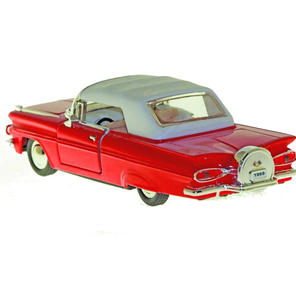 The 1959 Chevrolet Impala was radically reworked, sharing bodyshells with lower-end Buicks and Pontiacs as part of a GM economy move. Chevrolets rode on a wheelbase 1.5 inches longer than before. Atop a new X-frame chassis, roofs sat three inches lower, and bodies measured more than two inches wider overall. This growing size contributed to increased curb weight, reflecting the trends of the times. Its tailfins protruded outward rather than upward, adding to its distinctive look.