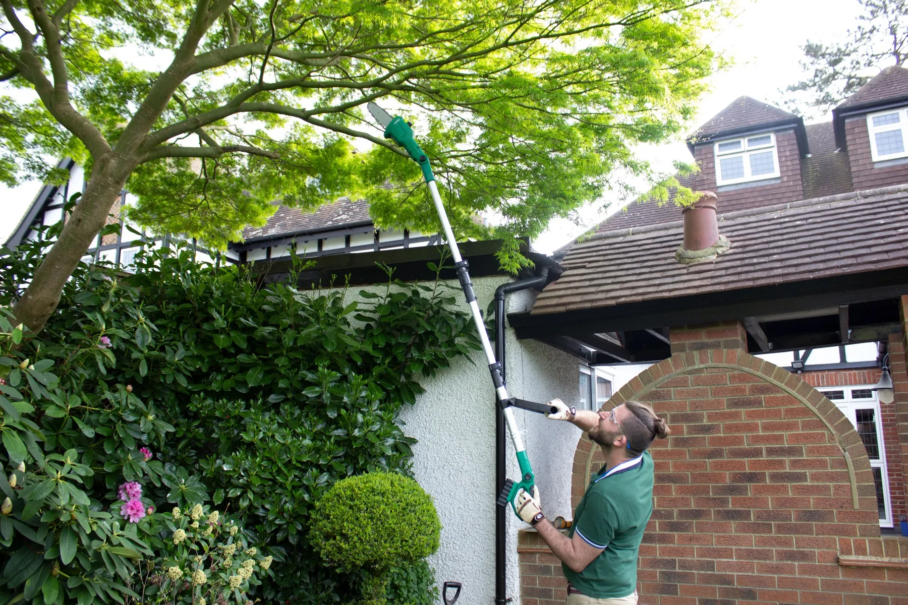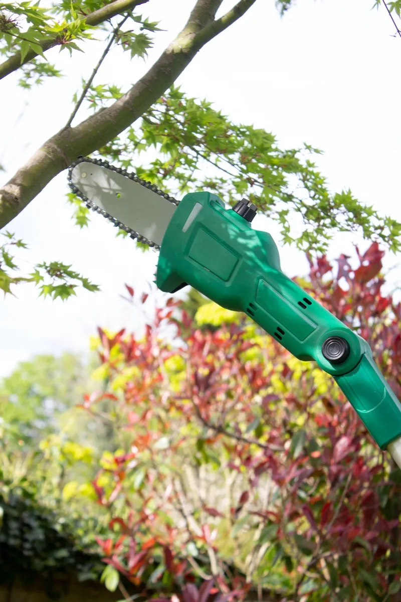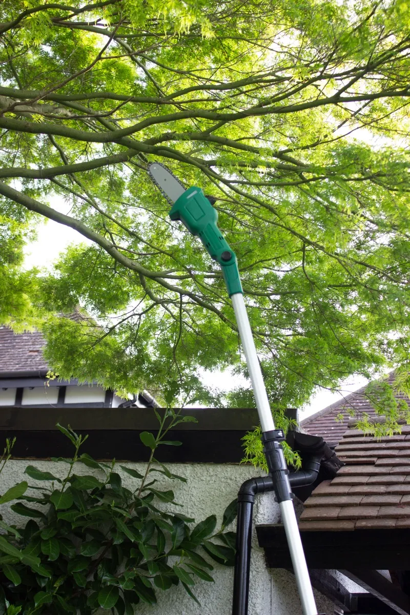 With the extension pole fitted, you can increase your reach up to 3 metres using the multi-angle hedge trimmer, and also the angled branch lopper chainsaw.