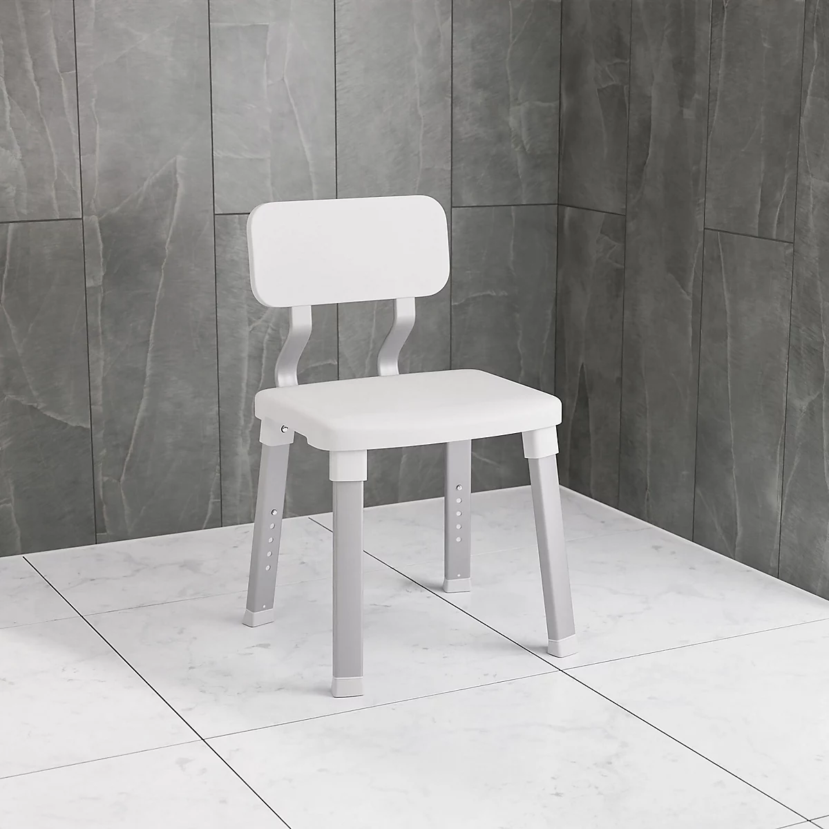 A stable, adjustable bathroom chair offering comfort and safety for independent daily use