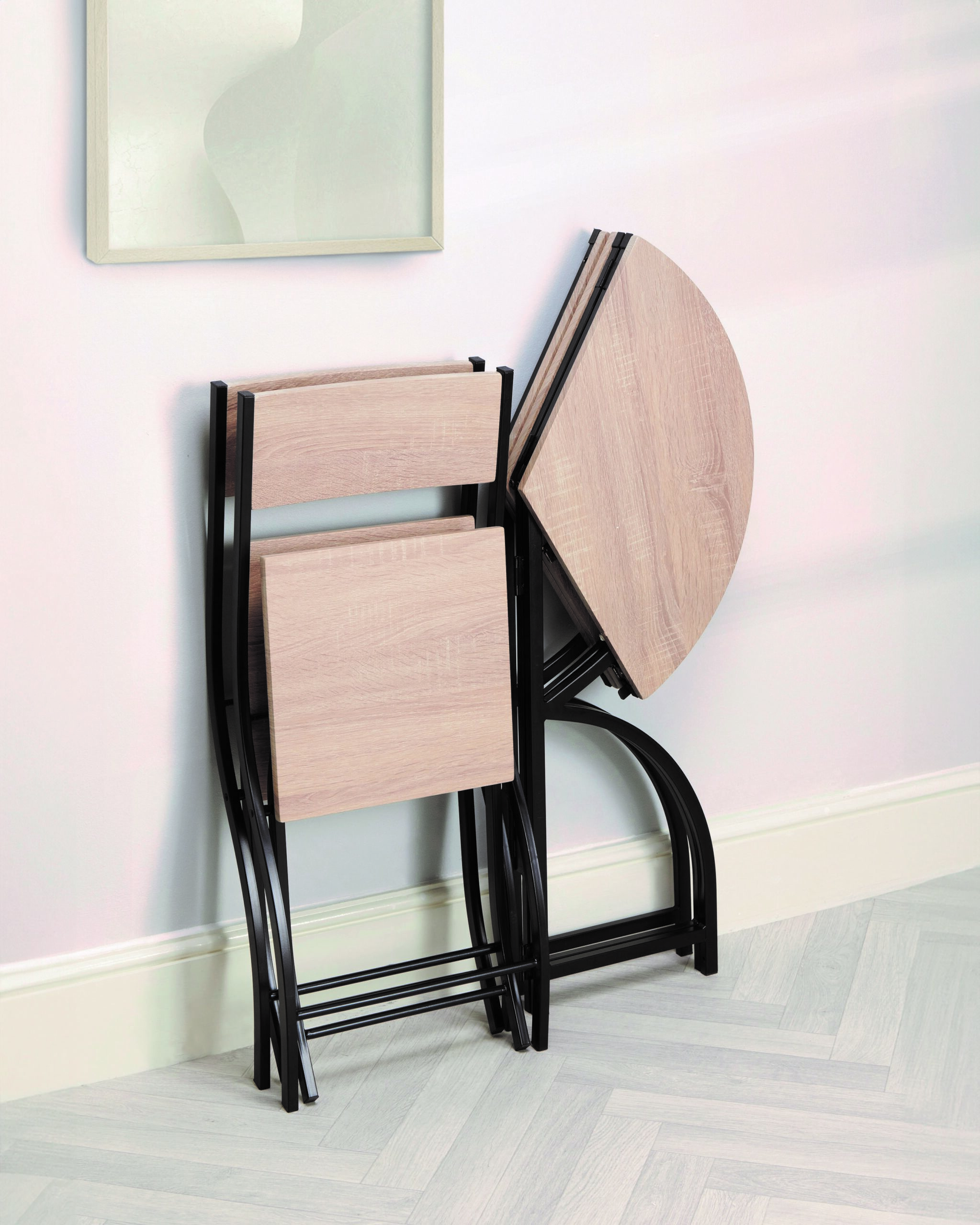 A compact and stylish foldable bistro set, perfect for saving space in any room.