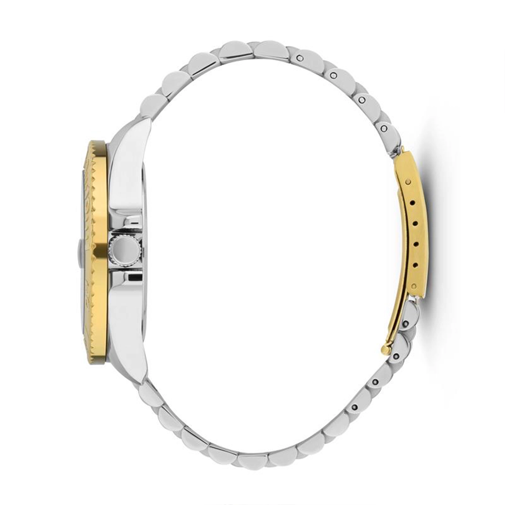 Both the watch and band are two-tone, giving you the best of both worlds. And its brass dial, luminous dots, turning bezel and bubble lens over the date window complete the muscular look.