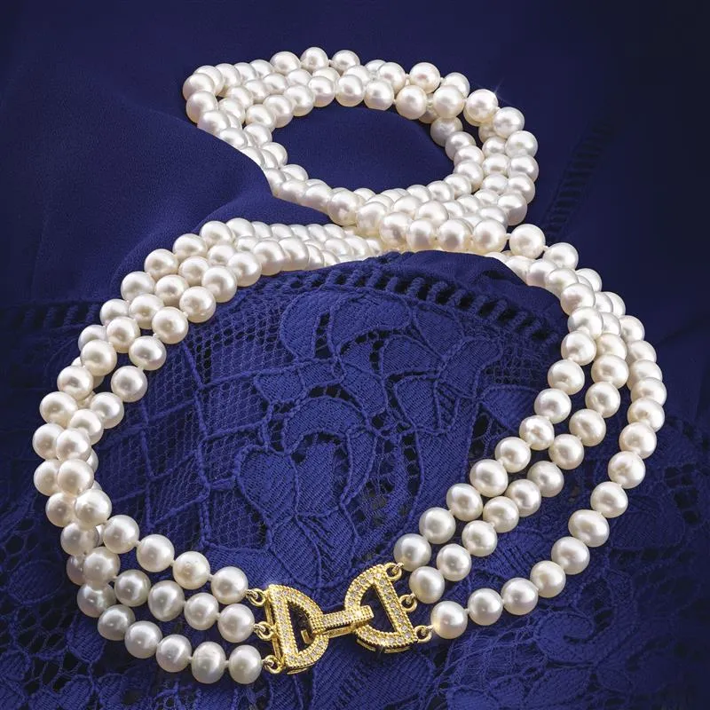 Present the one who stands by you with the First Lady Pearl Necklace. This elegant three-strand necklace features 226 beautiful, cultured freshwater pearls and secures with a fancy clasp that sparkles with rounds of our signature diamond alternative. A timeless piece of jewelry that will remind her shes first in your eyes every time she wears it.