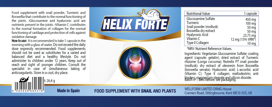 Helix Forte is a cutting-edge formula in capsule form designed to deliver comprehensive joint support. Packed with Nutrelix® snail powder, this supplement regenerates and strengthens joints while improving mobility. It includes glucosamine and hyaluronic acid, vital nutrients naturally present in joint cartilage, to enhance lubrication and flexibility.