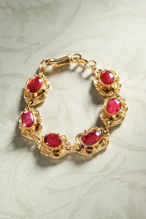 The Palio Ruby Necklace is a marriage of heritage and high fashion. Inside the floral-inspired, gold-fused metalwork, we’ve set 30 carats of enhanced faceted genuine rubies. These are the same luscious red stones coveted by European royals for centuries and each of the six spectacular ovals absolutely pops against the brilliant golden hue of the necklace. A truly amazing achievement. The 18″ necklace finishes with a medium-weight, gold-fused cable chain that secures with a lobster clasp.
