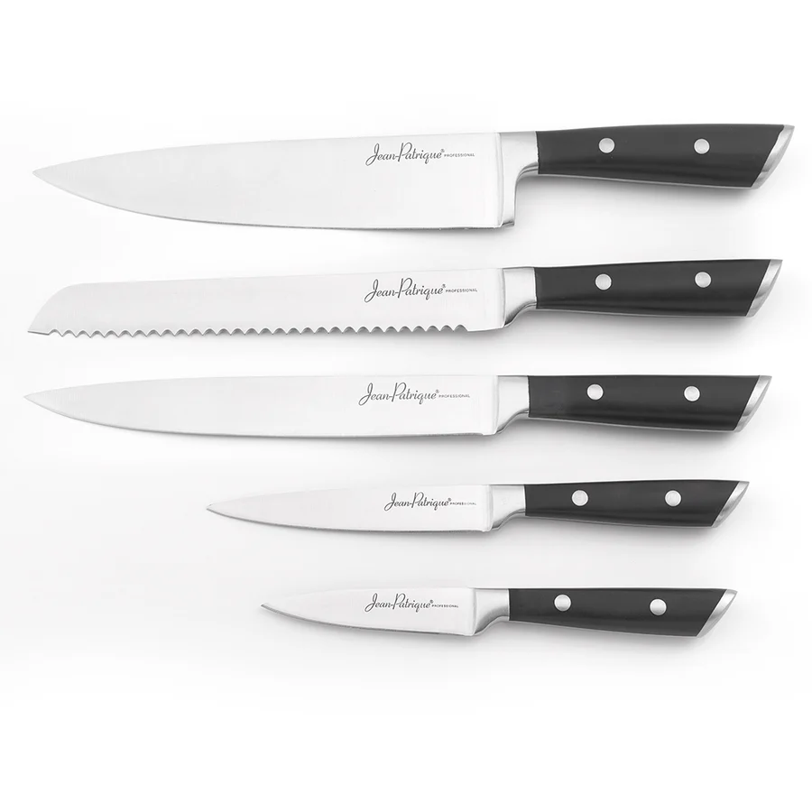 Each knife in the set is made from high carbon stainless steel for exceptional durability and precision cutting. The ergonomic black handles are triple-riveted for enhanced strength and control, allowing you to chop, slice, and dice with ease. With five versatile knives included, you’re ready for any kitchen task.