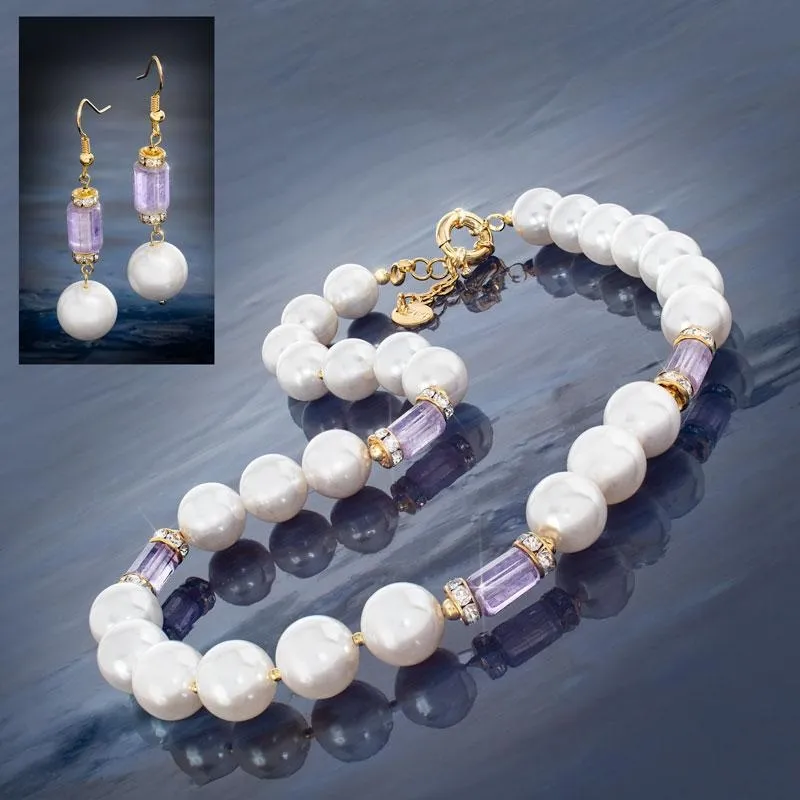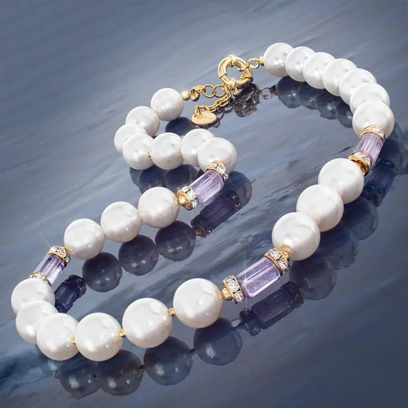 In the ancient worlds of Rome and Egypt, status was everything. The wealthy and powerful, including Cleopatra herself, made sure to flaunt their lofty positions by wearing opulent collections of glowing white beads and proud, purple amethysts. These exclusive gemstones denoted the wearers elevated status, because how else would they be able to acquire such expensive treasures?The Status Necklace gives you the same prestigious look enjoyed by the powerful and wealthy of the ancient empires. The 26 awe-inspiring pearlescent beads are made from the exact same organic substance as pearls, but can be formed into these luminous beads. Four amethyst gemstones sit between sequences of these luminous beads, adding even more royal prominence.
