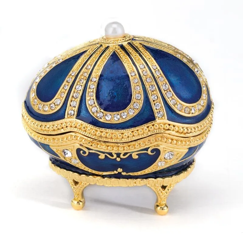 Add a touch of royal elegance to your collection with this miniature, fully functioning timepiece, beautifully housed inside a lavish, hand-painted enamel egg. Inspired by the legendary jeweled eggs created for the Russian Tsar in the late 1800s, this piece captures the opulence and intricate craftsmanship of history’s finest collectibles. The royal blue enamel is delicately accented with sparkling Austrian crystals, creating a stunning display of artistry.