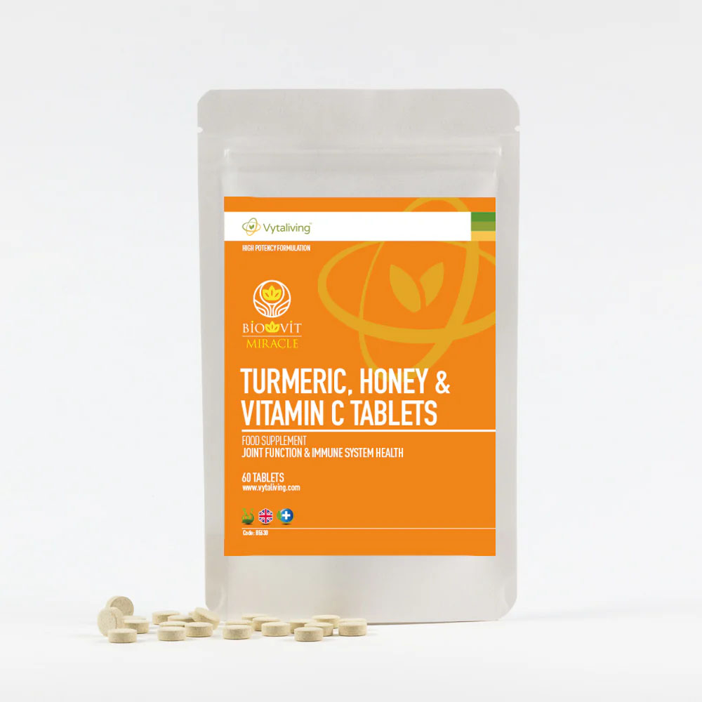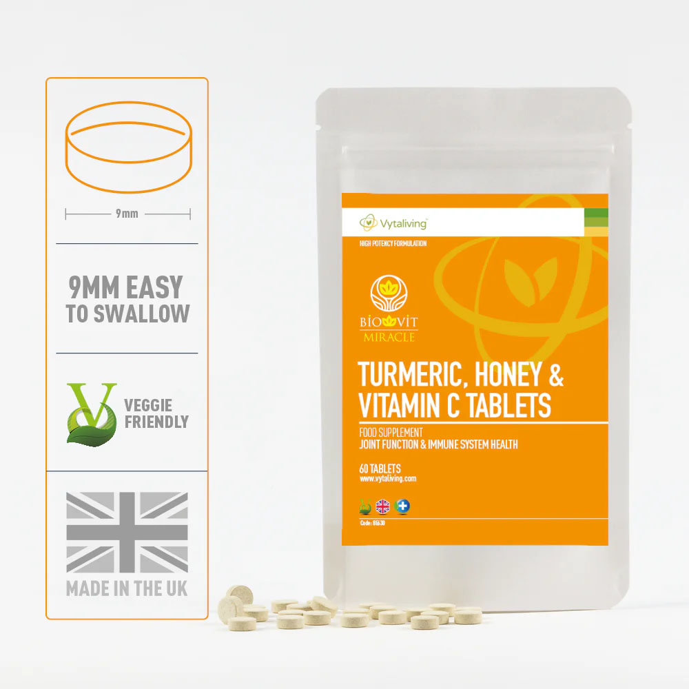 Our Turmeric, Honey, and Vitamin C tablets are formulated to deliver a high-strength blend of beneficial ingredients aimed at supporting joint and immune health. Each tablet contains 2500mg of potent turmeric, rich in curcumin and flavonoids, known for their anti-inflammatory and antioxidant properties. This supplement combines the best of nature’s remedies to promote overall wellness and vitality.